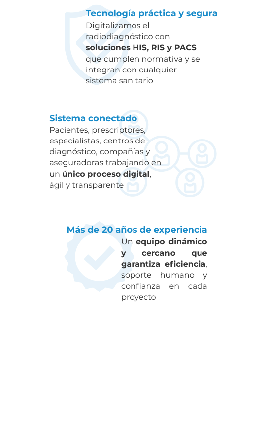 Nuestras soluciones HIS, RIS y PACS no solo cumplen con la normativa y se integran con los sistemas sanitarios, sino que realmente facilitan el trabajo diario de técnicos, radiólogos y personal administrativo, aportando eficiencia y tranquilidad.